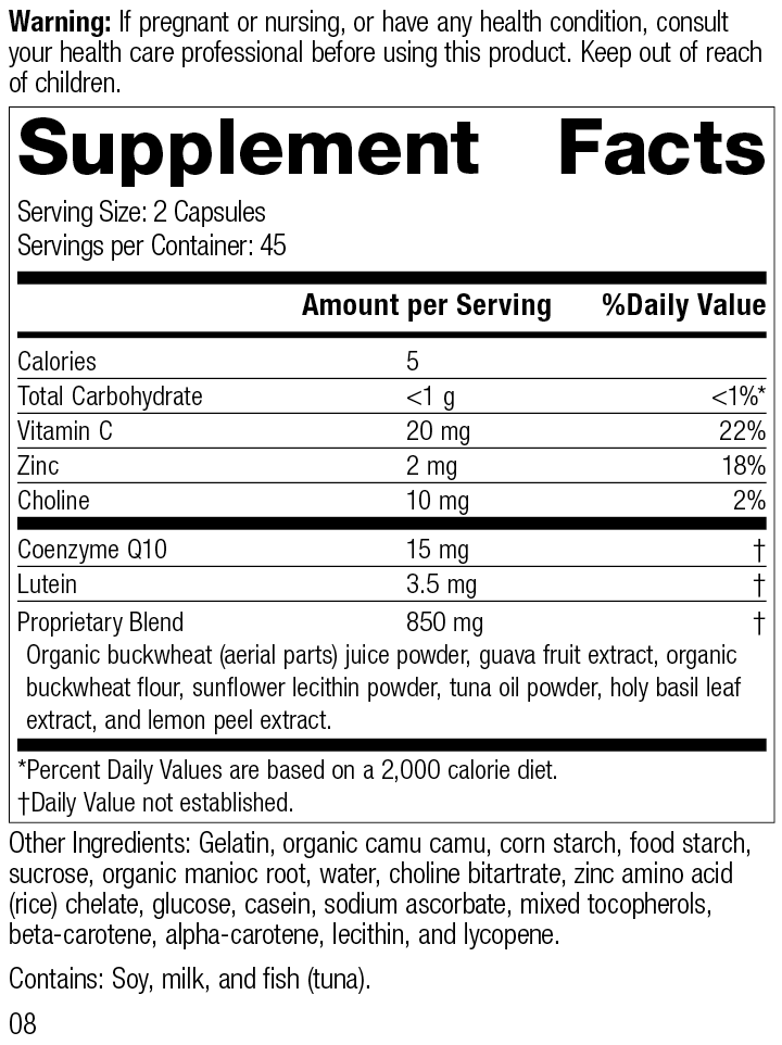 Each Serving Size (2 Capsules) contains: Calories 5, Total Carbohydrate <1 g, Vitamin C 20 mg, Zinc 2 mg, Choline 10 mg, Coenzyme Q10 15 mg, Lutein 3.5 mg. Proprietary Blend 850 mg: Organic buckwheat (aerial parts) juice powder, guava fruit extract, organic buckwheat flour, sunflower lecithin powder, tuna oil powder, holy basil leaf extract, and lemon peel extract. Other Ingredients: Gelatin, organic camu camu, corn starch, food starch, sucrose, organic manioc root, water, choline bitartrate, zinc amino acid (rice) chelate, glucose, casein, sodium ascorbate, mixed tocopherols, beta-carotene, alpha-carotene, lecithin, and lycopene. Contains: Soy, milk, and fish (tuna).